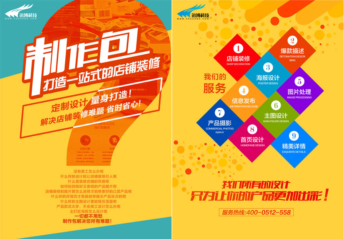 店鋪制作包:對店鋪的招牌,自定義模塊,分類、首頁以及寶貝詳情頁面的美化裝飾!結(jié)合產(chǎn)品特點配合整體版面布局以及色彩搭配為企業(yè)打造具有視覺沖擊力的店鋪,從而吸引買家的停留以及彰顯企業(yè)實力。